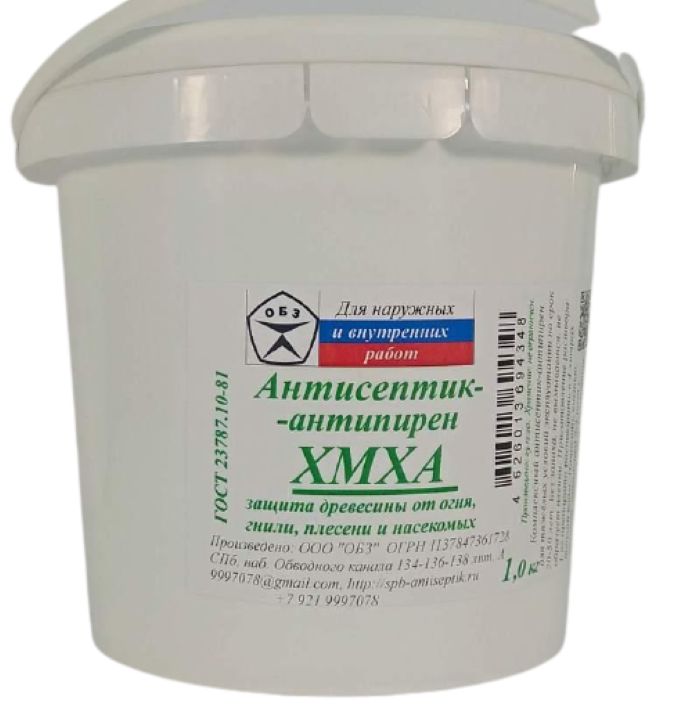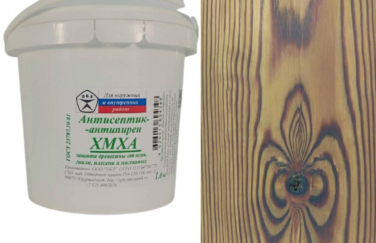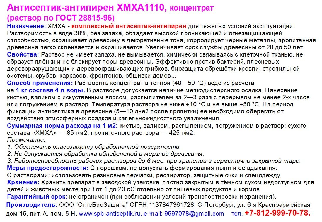 Невымываемый антисептик- антипирен . Растворимость в воде более 25%, без запаха, вызывает коррозию черных металлов, окрашивает древесину в зеленоватый цвет, пропитанная древесина склеивается и окрашивается, снижает прочность древесины при чистом поглощении более 20 кг/м3. Особенно эффективен против грибов умеренной гнили, менее эффективен против домовых грибов. Назначение: Защита деревянных строительных конструкций от биологического разрушения и огня (гниения, поражения древоточцами) в условиях IV—XVIII классов службы по ГОСТ 20022.2-80. Объекты защиты: деревянные конструкции, подверженные воздействию атмосферных осадков, капельножидкостному увлажнению, а также древесина в условиях ее непосредственного контакта с грунтом и водой (сваи, деревянные детали опор линий связи и электропередач, заборные и дорожные столбы, шпалы, лаги утопленные в грунт, настилы мостов, рудничные стойки, деревянные кровли, деревянные контейнеры, обшивка срубов, фронтонов, деревянные элементы теплиц ...) Свойства: Препарат «ХМХА-1110» водорастворимый, 3-х компонентный, невымываемый антисептик. Без запаха, окрашивает древесину в коричневый цвет, пропитанная древесина склеивается и окрашивается. Защищенная антисептиком древесина приобретает стойкость к воздействию биологических агентов ее разрушения (бактерий, грибов, насекомых, моллюсков, ракообразных) в условиях активного воздействия атмосферных осадков и контакта с грунтом. Пропитка деревянных конструкций антисептиком «ХМХА-1110» увеличивает срок их службы от в зависимости от поглощения (удержания) препарата древесиной и условий ее эксплуатации. Технология применения: Рабочий раствор антисептика -антипирена готовят путем растворения сухого состава в теплой (40—50°С) воде из расчета на 1 кг состава 4 л воды. В приготовленном растворе допускается наличие мелкодисперсного осадка и механических примесей. Полученный пропиточный раствор наносится на очищенную от пыли, мела, извести, краски и т. п. поверхность древесины ровным слоем без пропусков одним из следующих способов по ГОСТ 20022.6-93: кистью с синтетическим ворсом, валиком за 2—3 раза с перерывом между обработками не менее 2-х часов; погружением в раствор антисептика на 5—10 минут; Температура пропиточного раствора должна быть не ниже +10°С и не выше +50°С. Пропитка мерзлой и обледенелой древесины не рекомендуется. На период фиксации антисептика в древесине (5—10 дней после пропитки) ее необходимо оберегать от воздействия атмосферных осадков и капельно-жидкостного увлажнения. Не допускать попадания антисептика на конструкции и материалы, не подлежащие пропитке. Норма расхода: При пропитке древесины способом нанесения на поверхность кистью, валиком, распылением, погружением в раствор расход сухого состава 85 г/м2, расход пропиточного раствора 500 г/м2. При пропитке древесины под давлением способом ПВ, ВАД, и т.п. расход сухого состава составляет 5—15 кг/м3, расход пропиточного раствора 50—150 кг/м3. Параметры защищенности применительно к конкретному объекту защиты устанавливают по ГОСТ 20022.0 в зависимости от условий эксплуатации, пропитываемости древесины и ее сортамента.