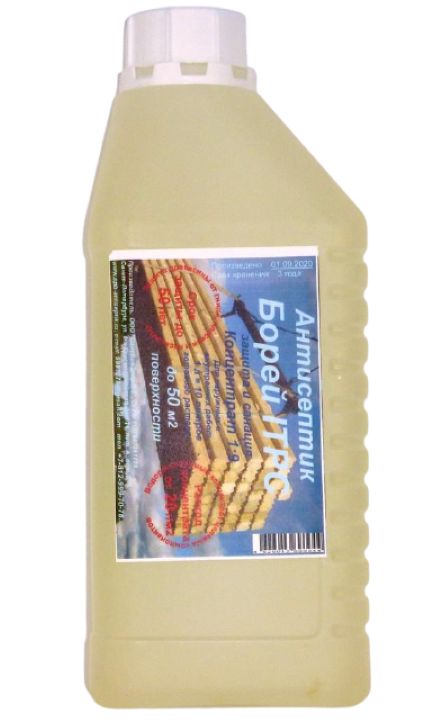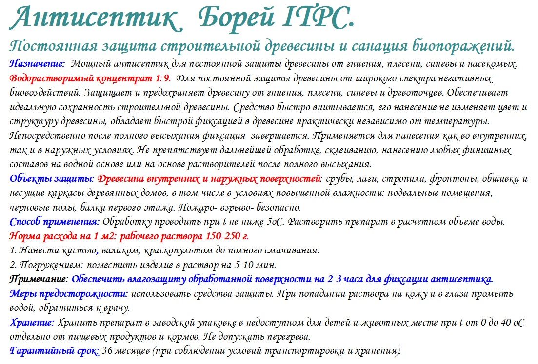 Мощный антисептик для постоянной защиты внутренних и наружных поверхностей строительной древесины от дереворазрушающих, плесневых, деревоокрашивающих грибов и насекомых. Не содержит солей тяжелых металлов, мышьяка, хрома, растворимых фторидов, фенолов и соединений запрещенных к применению в Евросоюзе. Назначение: Для постоянной защиты древесины от широкого спектра негативных биовоздействий. Защищает и предохраняет древесину от гниения, плесени, синевы и древоточцев. Обеспечивает идеальную сохранность строительной древесины. Средство быстро впитывается, его нанесение не изменяет цвет и структуру древесины, обладает быстрой фиксацией в древесине практически независимо от температуры. Непосредственно после полного высыхания фиксация практически завершается. . Применяется для нанесения как во внутренних, так и в наружных условиях. Не препятствует дальнейшей обработке, склеиванию, нанесению любых финишных составов на водной основе или на основе растворителей после полного высыхания. Состав: представляет собой комплекс целевых компонентов на основе IPBC, триазолов и четвертичных аммониевых соединений (ЧАС) и пиретроидов. Не содержит солей тяжелых металлов; дополнительно может содержать: связующие (природные биополимеры-биоклей), сорастворители, технологические добавки, фиксатив, УФ-стабилизатор; вещества, препятствующие расслаиванию и образованию поверхностной пленки. Объекты защиты: Древесина внутренних и наружных поверхностей: срубы, лаги, стропила, фронтоны, обшивка и несущие каркасы деревянных домов, в том числе в условиях повышенной влажности: подвальные помещения, черновые полы, балки первого этажа. Способ применения: Поверхности, на которые будет нанесено средство, должны быть очищены от пыли и грязи. Удалить все предыдущие финишные покрытия или репелленты. . Рабочий раствор нанести древесину кистью (валиком, краскопультом) до полного смачивания поверхности. Расход готового пропиточного раствора 125 гр/м2. Обработку проводить при t не ниже -25°C. Обработанная поверхность не должна подвергаться воздействию дождя или снега, как минимум, 2 часа после нанесения средства. При необходимости защитите обработанные участки укрытием. Норма расхода на 1 м2: Рабочего раствора 125 г. Расход средства может отличаться, в зависимости от породы дерева, текстуры поверхности и пористости обрабатываемой древесины. ,