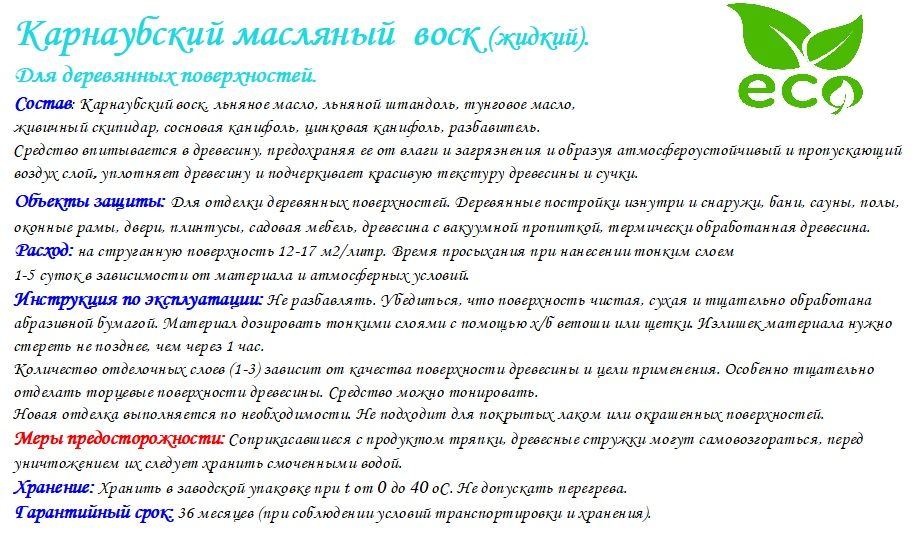 Карнаубский масляный воск – это продукт, сделанный на базе льняного, тунгового масла, карнаубского воска, живичного скипидара.