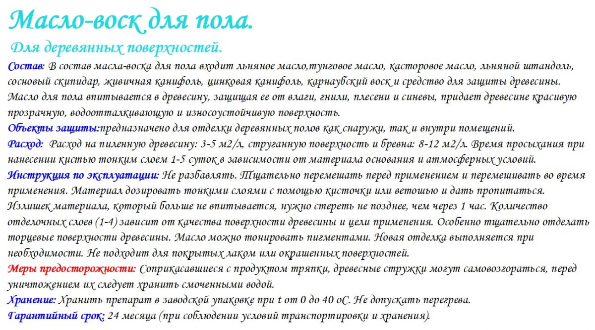 В состав масло-воска для пола входит льняное, тунговое масло, сосновый скипидар, сосновая смола, карнаубский воск, живичная канифоль, цинковая канифоль, микронизированный кварц, средство для защиты древесины, сиккатив. Масло впитывается в древесину, защищая ее от влаги, гнили, плесени и синевы, придает древесине красивую прозрачную и водоотталкивающую поверхность. Объекты защиты: Бревенчатые постройки, садовая мебель, садовые домики, термически обработанная древесина, фасады из кирпича и неглазурованной керамической плитки.