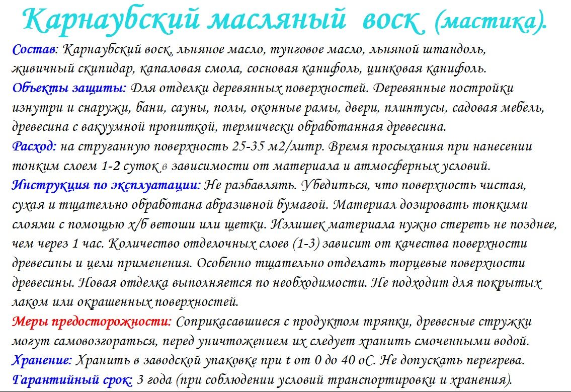 Мастика карнаубского масляного воска – это продукт, сделанный на базе карнаубского воска и терпентинового, тунгового и льняного масла, живичной канифоли. Сохраняет натуральный тон новых и старых деревянных поверхностей и хорошо выделяет текстуру дерева. Карнаубский масляный воск содержит наиболее твердый из всех природных восков воск карнаубской пальмы, который придает деревянной поверхности шелковистый блеск и придает древесине водоотталкивающие свойства. Подходит для обработки как светлых пород дерева, так и поверхностей из ценных пород древесины. Влагостоек и наиболее устойчив к истиранию, хорошо защищает от износа. Легко использовать, он базируется на основе натурального сырья; идеален, чтобы поддержать натуральный вид большинства типов деревянных поверхностей. Хорошо подходит для обработки банных полков и стен, жилых помещений, спален, лестниц, мебели и дверей как внутри помещений, так и снаружи . .