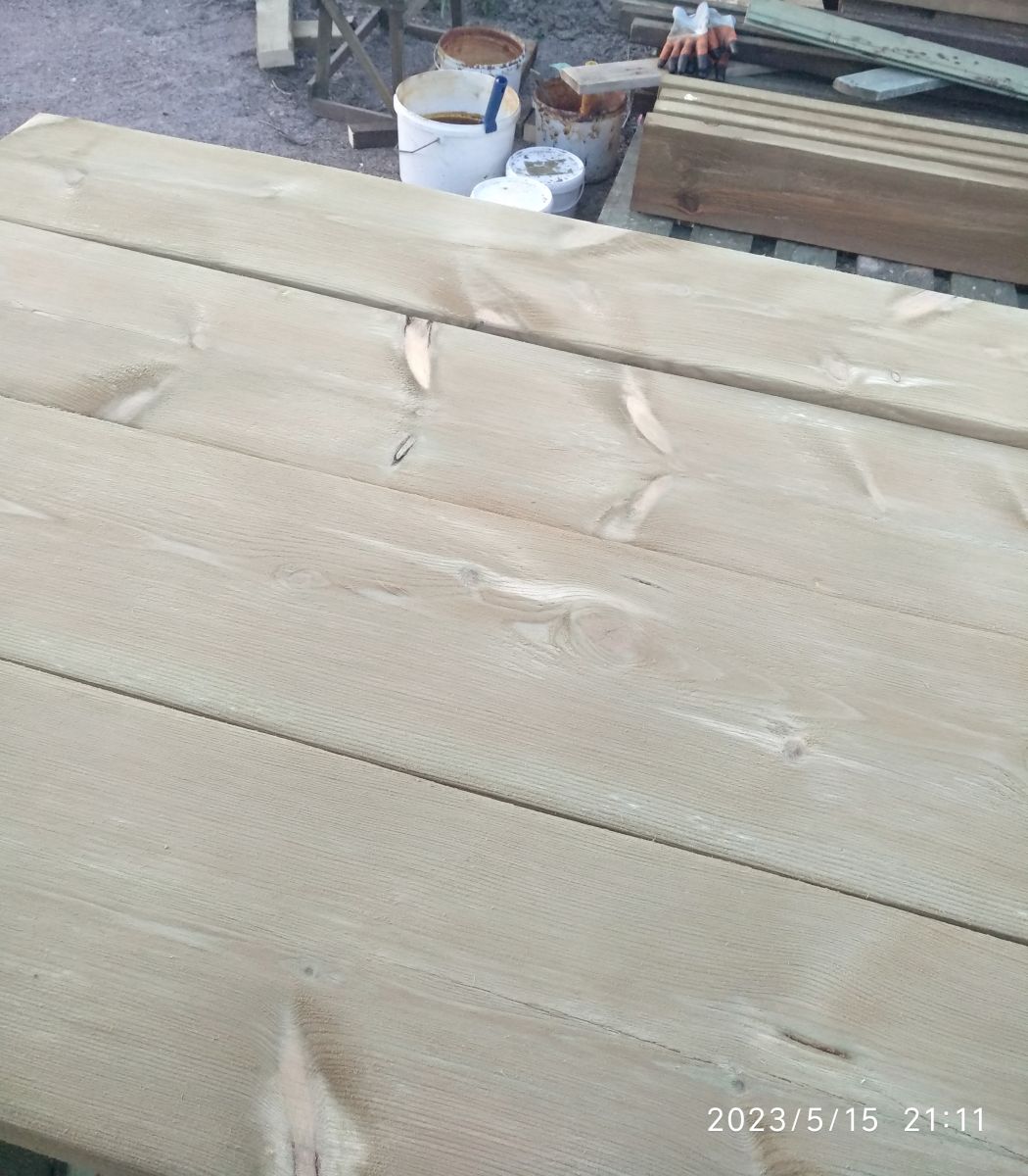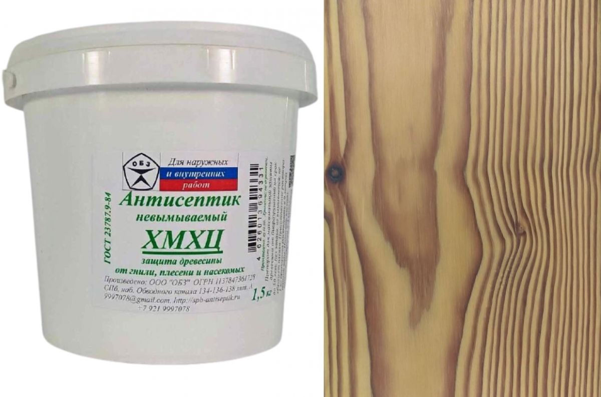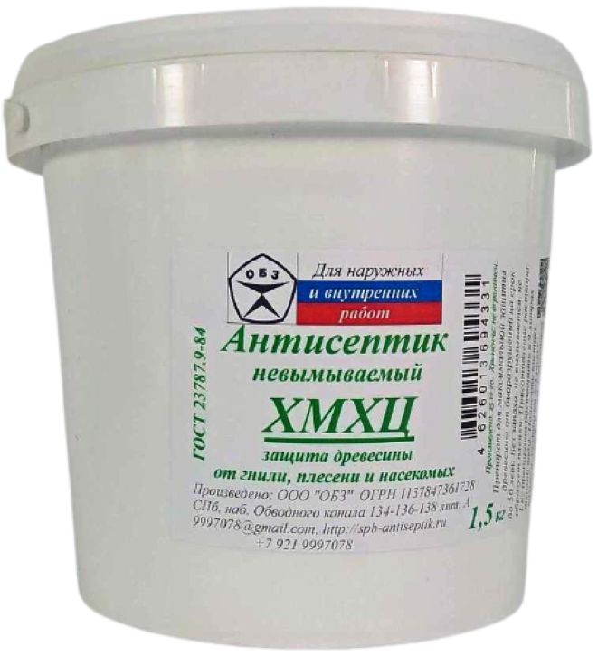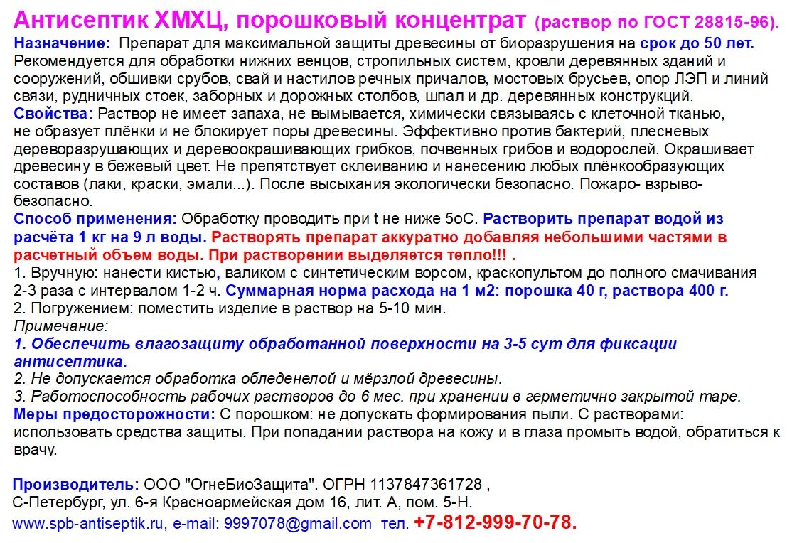 Наиболее мощный невымываемый антисептик для тяжелых условий эксплуатации. Растворимость в воде более 10%, без запаха, вызывает коррозию черных металлов, окрашивает древесину в зеленоватый цвет, пропитанная древесина склеивается и окрашивается, снижает прочность древесины при чистом поглощении более 20 кг/м3. Особенно эффективен против грибов умеренной гнили, менее эффективен против домовых грибов. Назначение: Защита деревянных строительных конструкций от биологического разрушения (гниения, поражения древоточцами) в условиях IV—XVIII классов службы по ГОСТ 20022.2-80. Объекты защиты: деревянные конструкции, подверженные воздействию атмосферных осадков, капельножидкостному увлажнению, а также древесина в условиях ее непосредственного контакта с грунтом и водой (сваи, деревянные детали опор линий связи и электропередач, заборные и дорожные столбы, шпалы, лаги утопленные в грунт, настилы мостов, рудничные стойки, деревянные кровли, деревянные контейнеры, обшивка срубов, фронтонов, деревянные элементы теплиц ...) Свойства: Препарат «ХМХЦ» водорастворимый, 3-х компонентный, невымываемый антисептик. Без запаха, окрашивает древесину в песочно-фисташковый цвет, пропитанная древесина склеивается и окрашивается. Защищенная антисептиком «ХМХЦ» древесина приобретает стойкость к воздействию биологических агентов ее разрушения (бактерий, грибов, насекомых, моллюсков, ракообразных) в условиях активного воздействия атмосферных осадков и контакта с грунтом. Пропитка деревянных конструкций антисептиком «ХМХЦ» увеличивает срок их службы от 25 до 50 лет в зависимости от поглощения (удержания) препарата древесиной и условий ее эксплуатации. Технология применения: Рабочий раствор антисептика «ХМХЦ» готовят путем растворения сухого состава в теплой (40—50°С) воде из расчета на 1 кг состава 9 л воды. Для поддержания стабильности раствора к нему добавляют уксусную кислоту ледяную из расчета на 1 л раствора 0,5 мл или 5,5 мл 9% столового уксуса. В приготовленном растворе допускается наличие мелкодисперсного осадка и механических примесей. Полученный пропиточный раствор наносится на очищенную от пыли, мела, извести, краски и т. п. поверхность древесины ровным слоем без пропусков одним из следующих способов по ГОСТ 20022.6-93: кистью с синтетическим ворсом, валиком за 2—3 раза с перерывом между обработками не менее 2-х часов; погружением в раствор антисептика на 5—10 минут; Температура пропиточного раствора «ХМХЦ» должна быть не ниже +10°С и не выше +50°С. Пропитка мерзлой и обледенелой древесины не рекомендуется. На период фиксации антисептика в древесине (5—10 дней после пропитки) ее необходимо оберегать от воздействия атмосферных осадков и капельно-жидкостного увлажнения. Не допускать попадания антисептика на конструкции и материалы, не подлежащие пропитке. Норма расхода: При пропитке древесины способом нанесения на поверхность кистью, валиком, распылением, погружением в раствор расход сухого состава 50 г/м2, расход пропиточного раствора 500 г/м2. При пропитке древесины под давлением способом ПВ, ВАД, и т.п. расход сухого состава составляет 5—15 кг/м3, расход пропиточного раствора 50—150 кг/м3. Параметры защищенности применительно к конкретному объекту защиты устанавливают по ГОСТ 20022.0 в зависимости от условий эксплуатации, пропитываемости древесины и ее сортаме