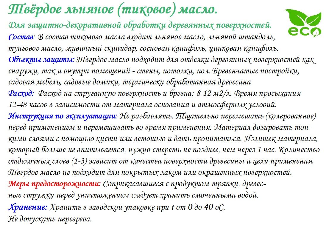 Великолепно сбалансированный состав природных компонентов данного продукта, позволяет позиционировать его как универсальное масло, которое можно использовать как для наружных (фасады, садовая мебель и т.д.), так и для внутренних работ (стены, потолки, полы, мебель), а так же для обработки предметов с повышенными экологическими требованиями, такими как кухонные столешницы, разделочные доски, банный интерьер, детские игрушки и т.п.. В состав твёрдого масла входят льняное масло, льняной штандоль, тунговое масло, сосновая смола, сосновый скипидар, живичная канифоль, цинковая канифоль. Твердое масло для дерева применяется для создания финишного износоустойчивого покрытия на деревянных поверхностях, подвергаемых высокой нагрузке. Твердое масло впитывается в древесину, предохраняя ее от влаги и образует очень прочную, износоустойчивую защиту от грязи и воды, но пропускающий воздух слой, уплотняет древесину и подчеркивает красивую текстуру древесины и сучки. Материал поставляется не колерованным. Расход на струганную деревянную поверхность 8-12 м2/л.